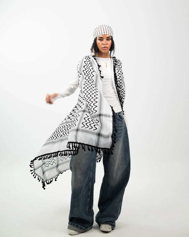 The Kuffiyeh Vest Collection transforms the timeless Palestinian kuffiyeh into a bold, modern silhouette. Each vest is cut with precision and crafted from authentic kuffiyeh fabric, blending traditional patterns with contemporary streetwear design.