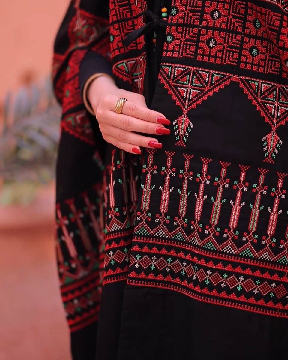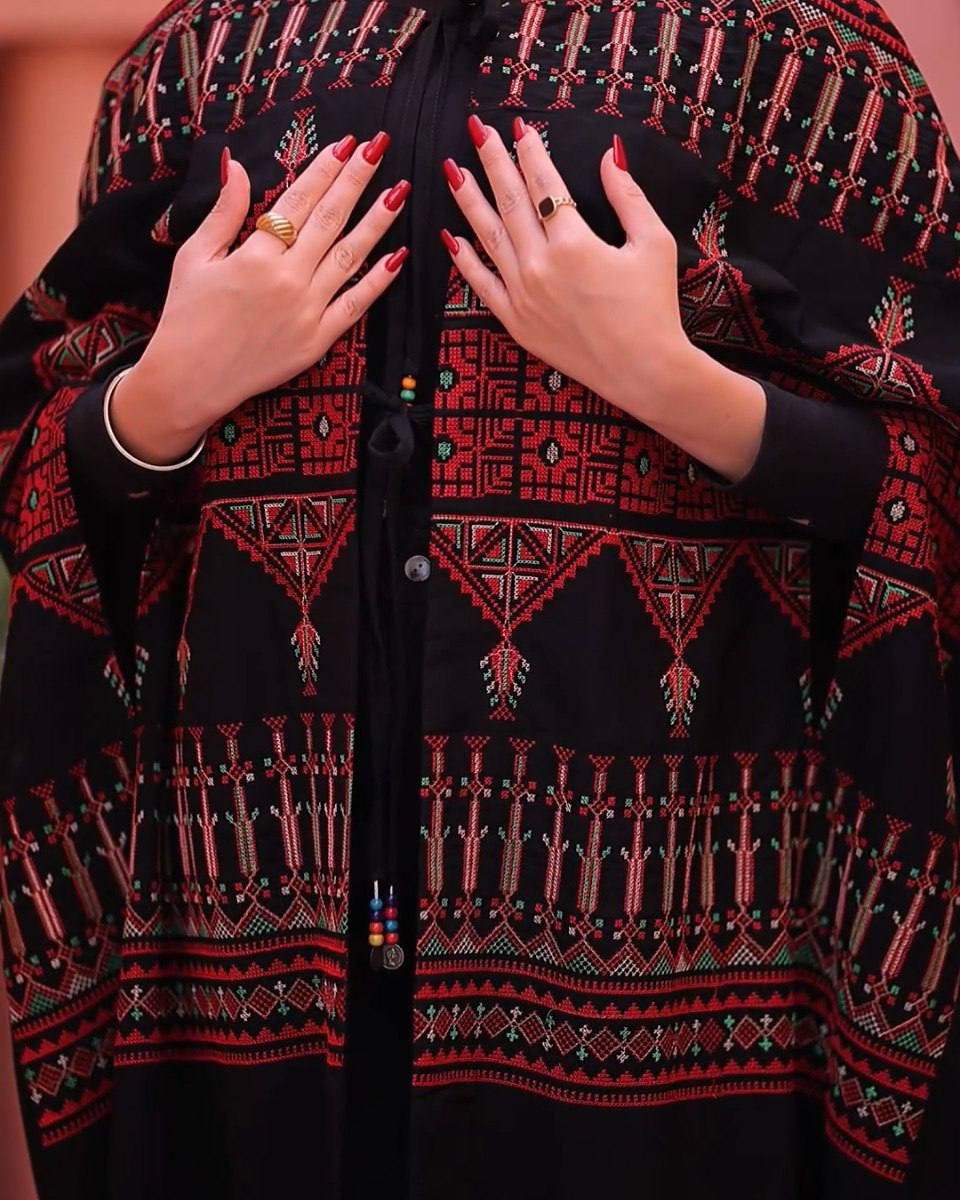 El asombroso bordado Tatreez , bordado en rojo intenso y sutiles detalles en verde, evoca siglos de tradición y narra historias de fuerza, identidad y orgullo cultural. Sus motivos geométricos, inspirados en la arquitectura atemporal de Jerusalén, convierten esta pieza en una declaración de tradición y elegancia moderna.