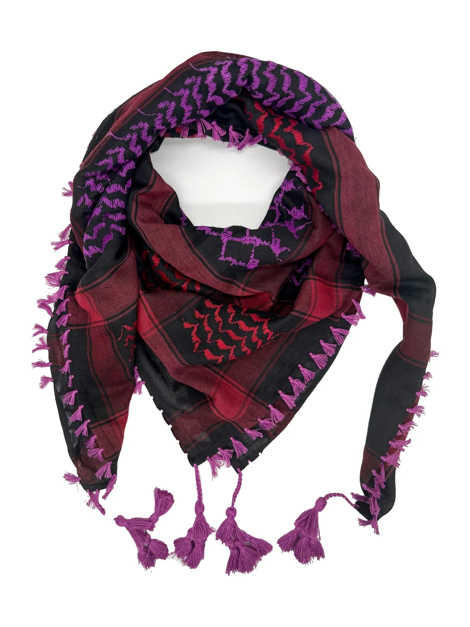 Haga una declaración audaz y celebre la cultura palestina con nuestra kuffiyeh roja, rosa y negra de YAFA ARTS, donde los colores apasionados se combinan con la tradición eterna.