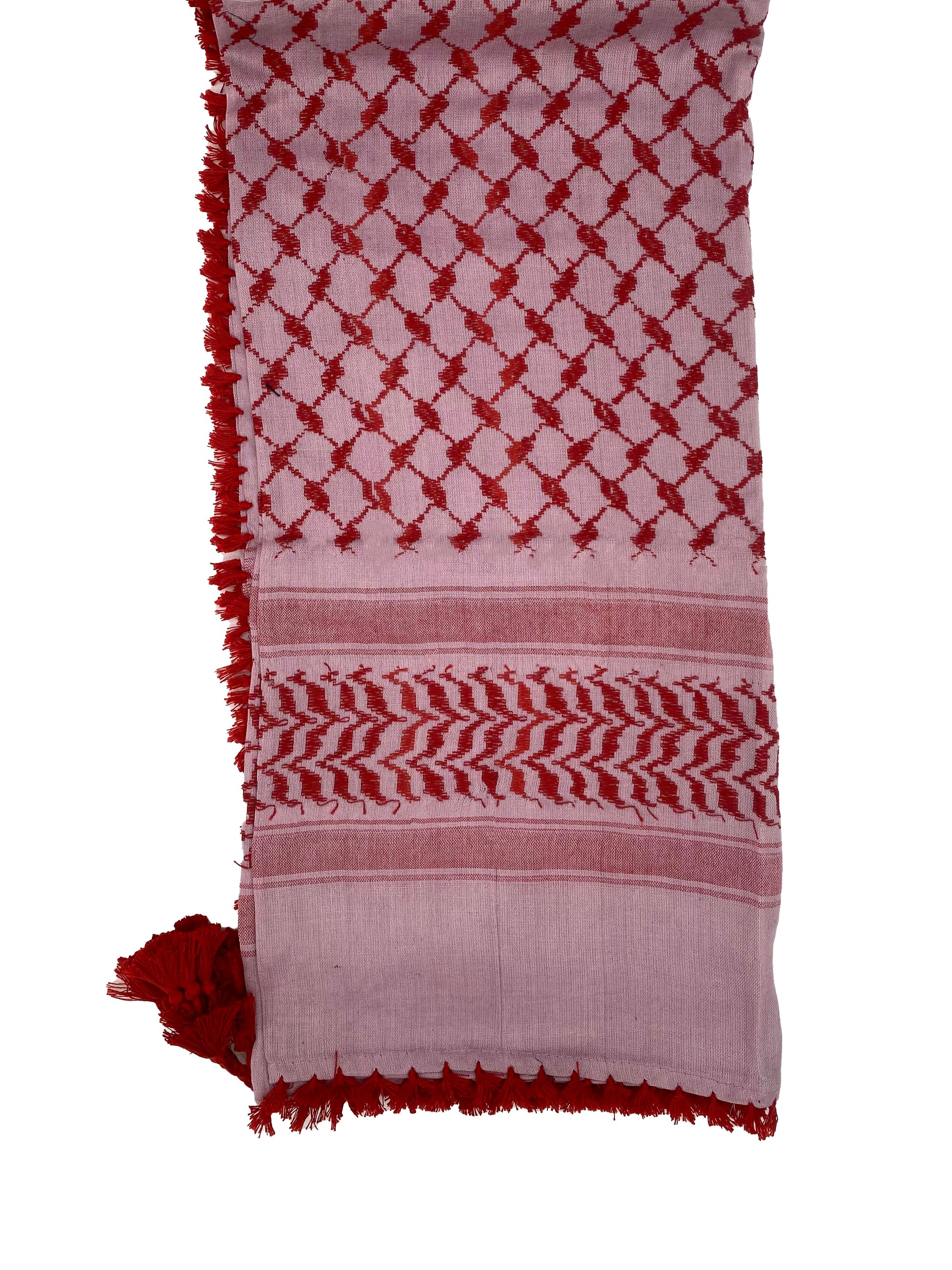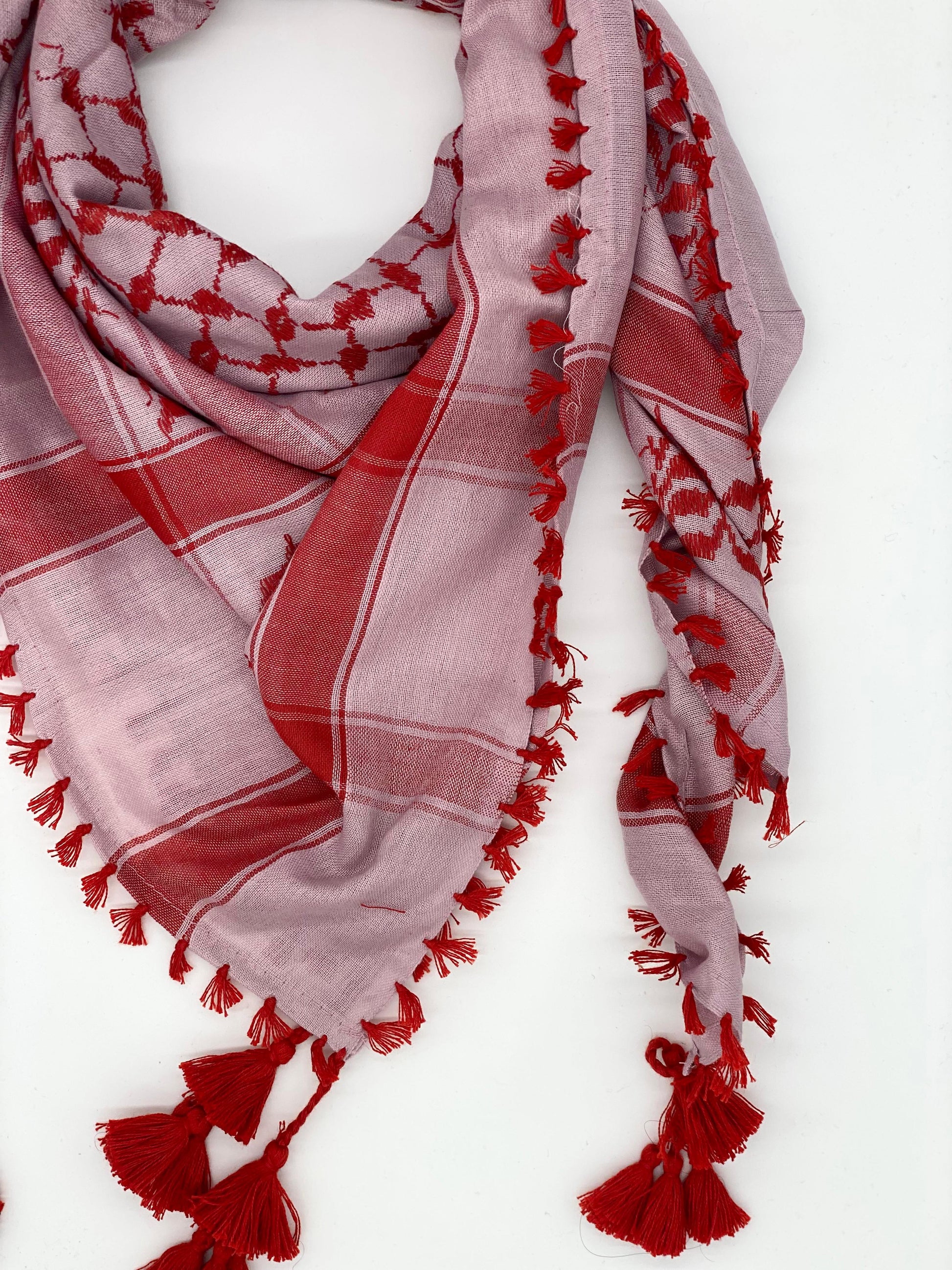 Elevate your wardrobe and honor our heritage with the Soft Pink X Red Kuffiyeh – where timeless tradition meets contemporary grace.